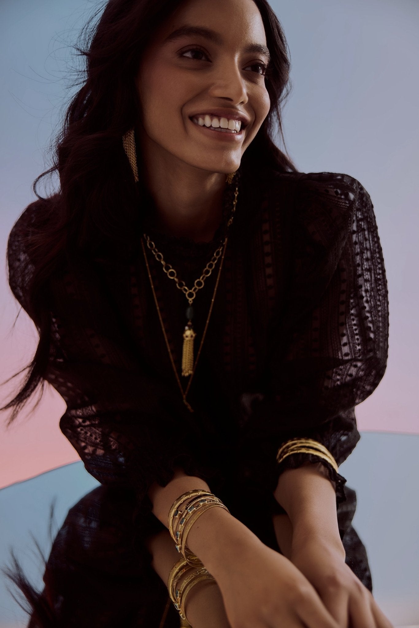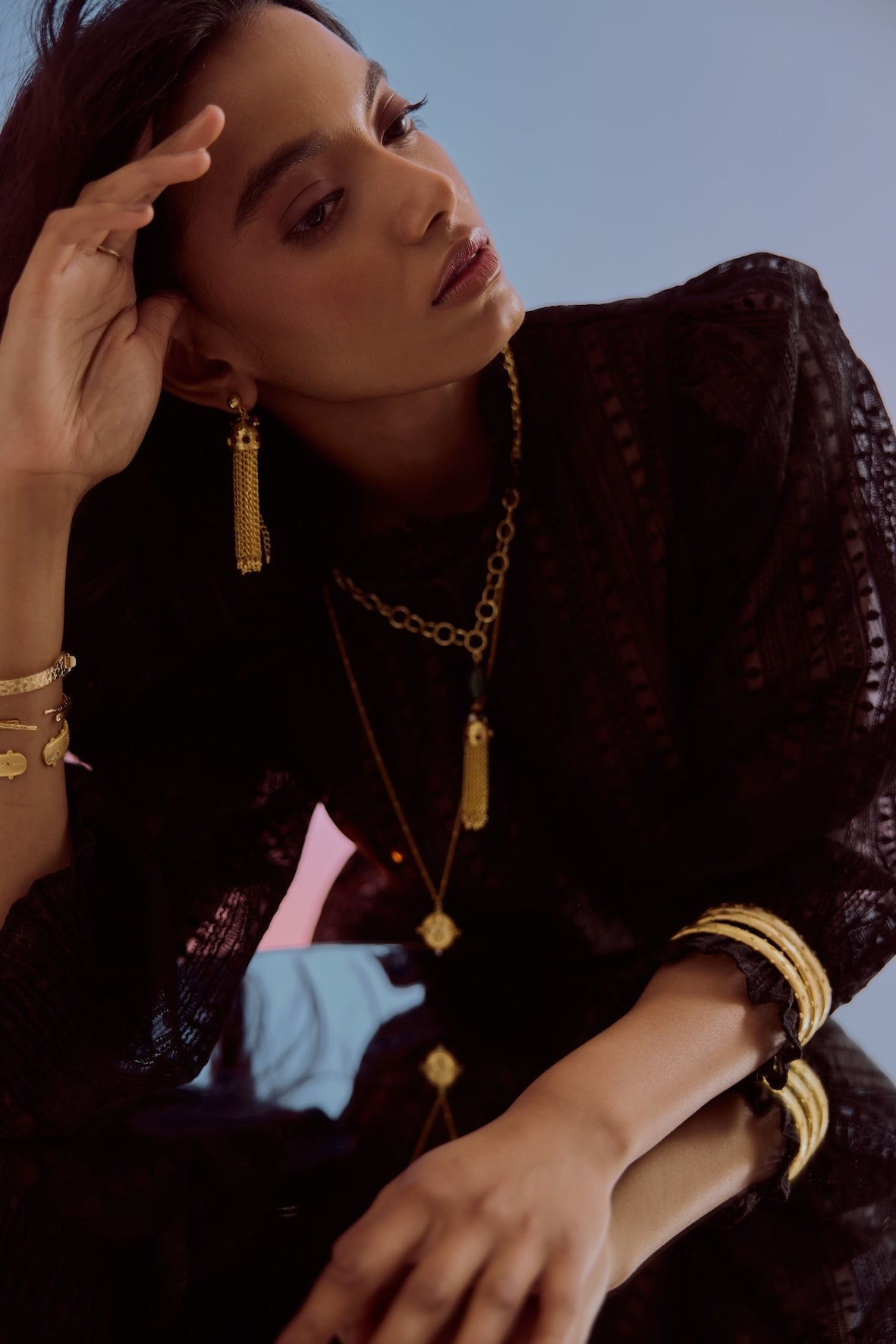 Crafted in 18k gold plated gold, individual chains are finished with our signature rawa gold balls to create a flowing tassel, with delicate faceted high vibe semi precious stones to complete it's energy elevating aesthetic.