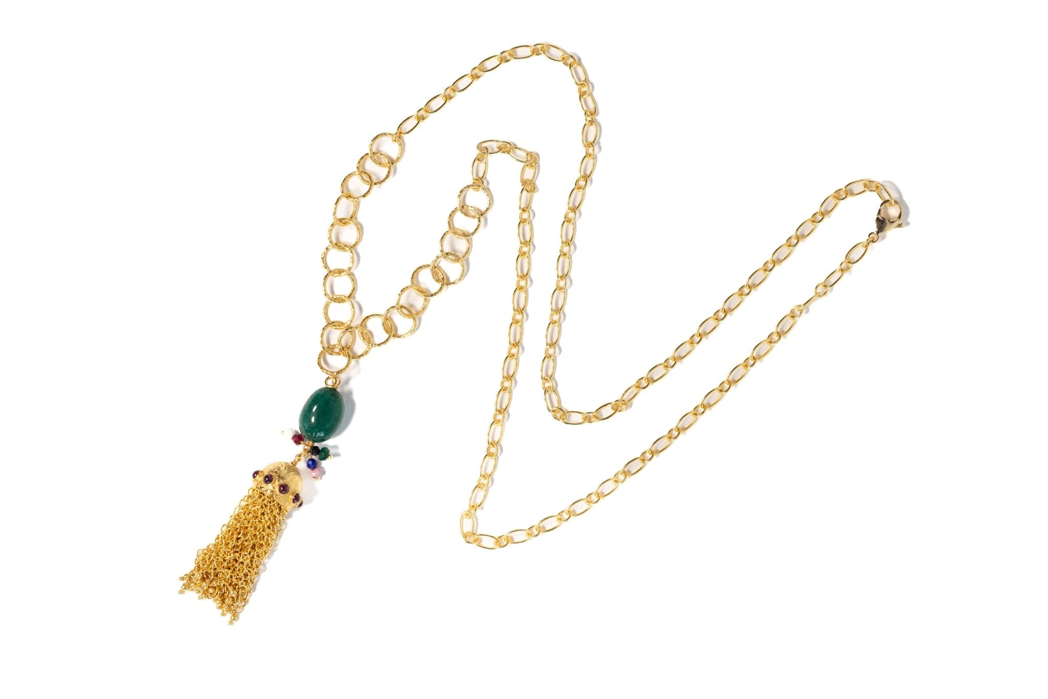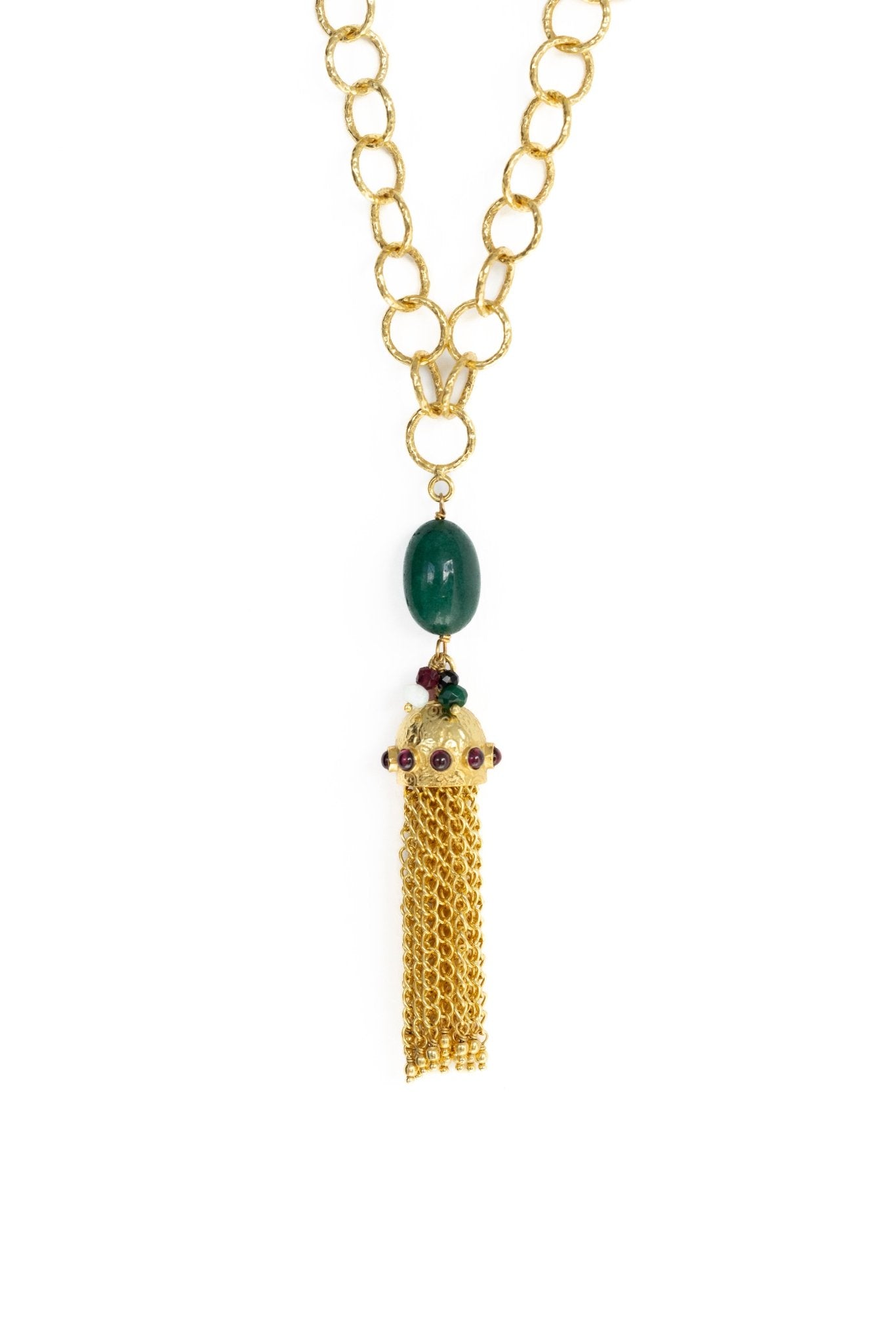 This cascading statement tassel pendant necklace connects you to the free-spirited relaxed glamour of the 70s. With a hand pressed paisley pattern dome top featuring cabochon garnet stones.