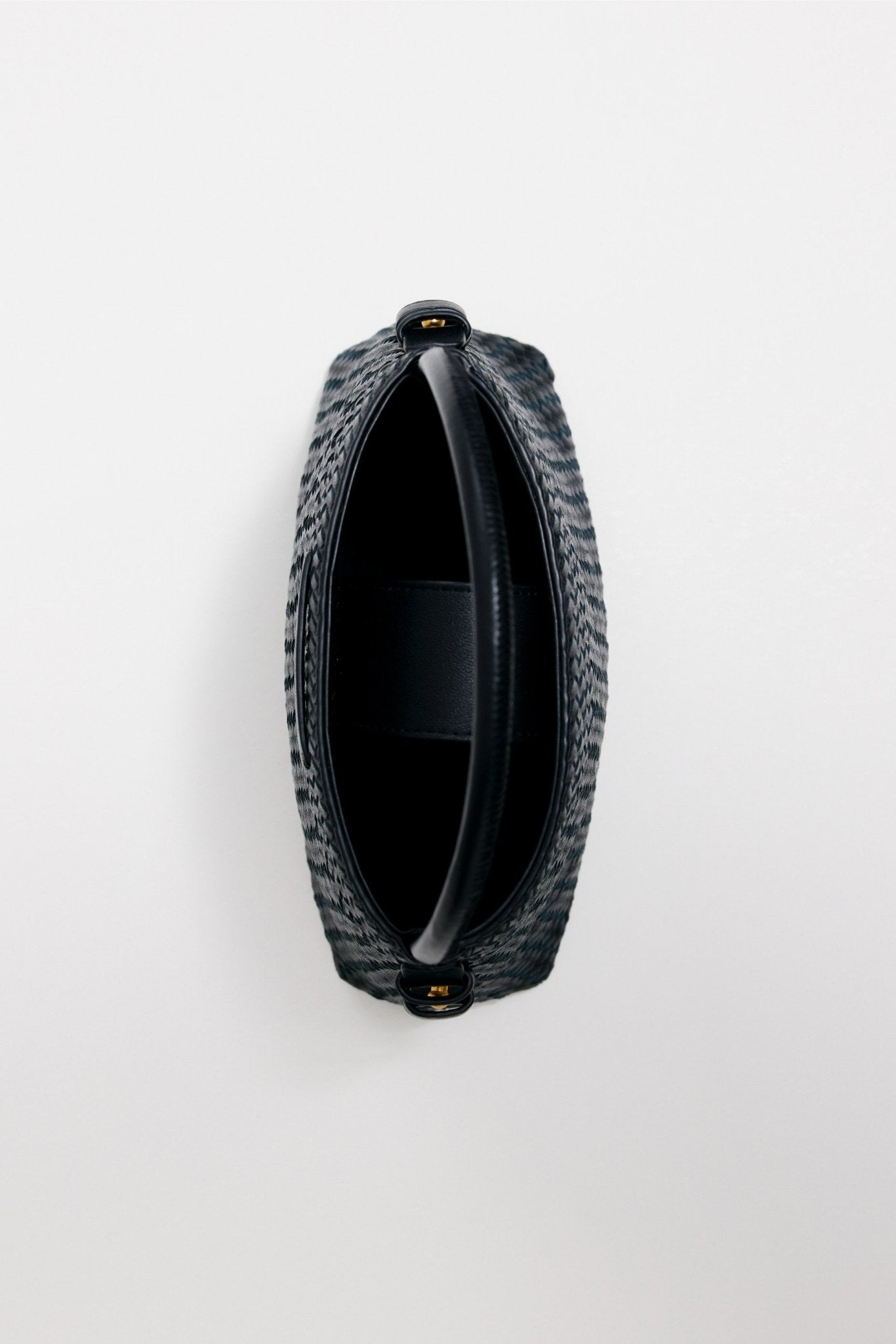 The Luna Woven Bucket Bag, featuring carefully hand-woven leather panels and an elevated split weave design across the top.