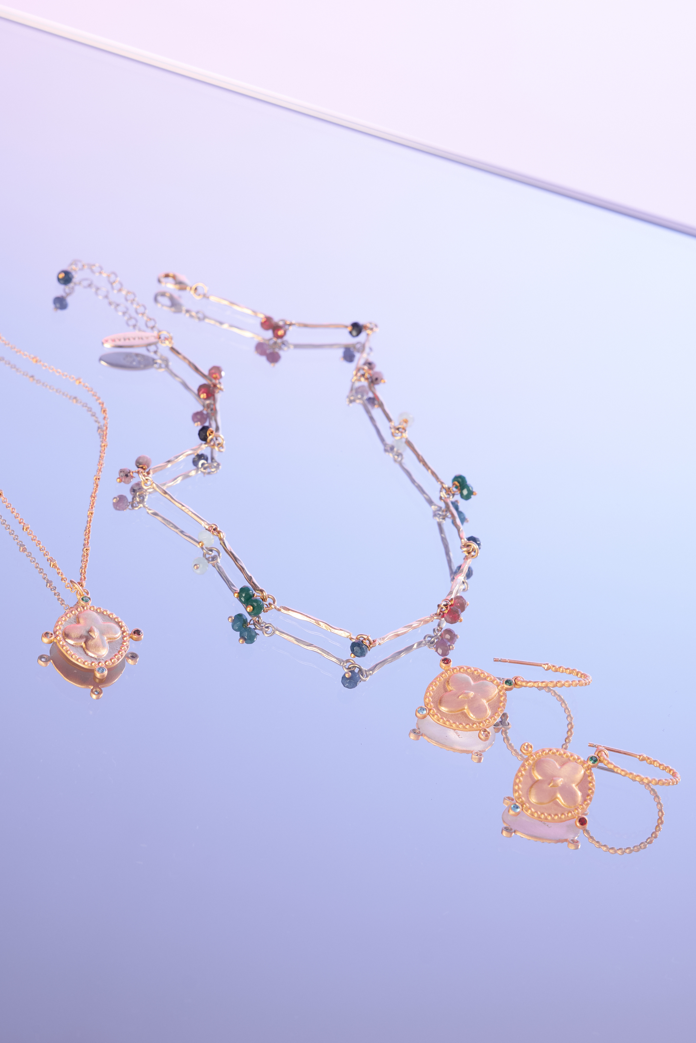 This timeless piece honours the strength, beauty, and energy of m(other)hood, crafted from gold plated brass with iridescent mixed cubic zirconias.