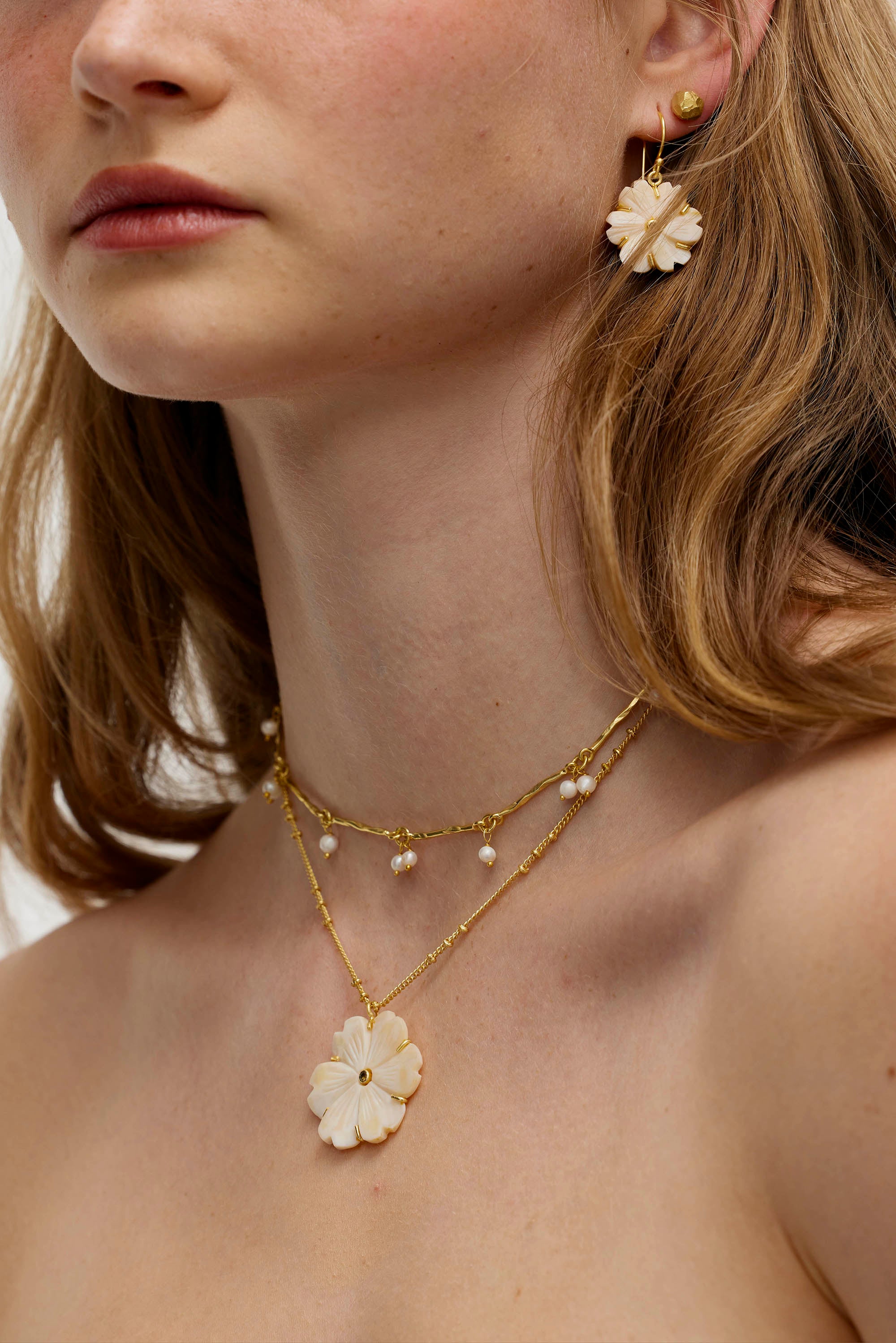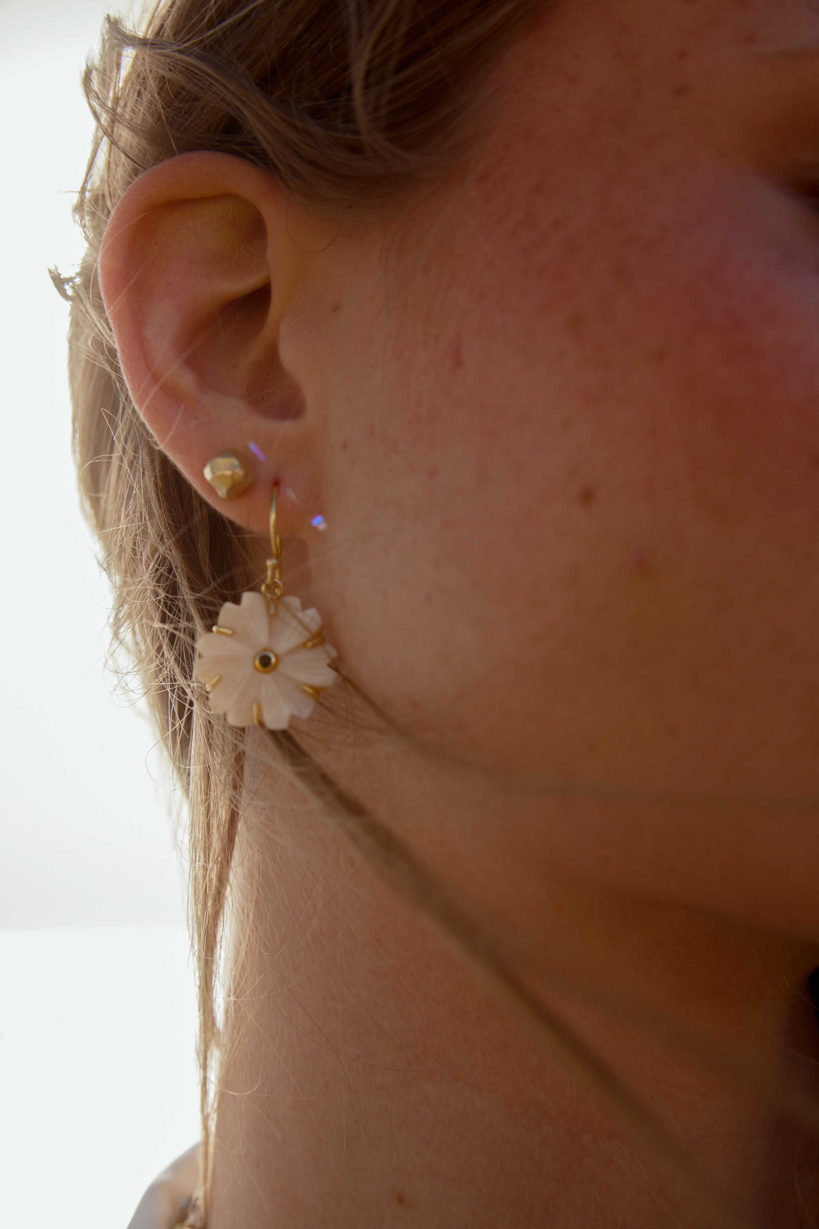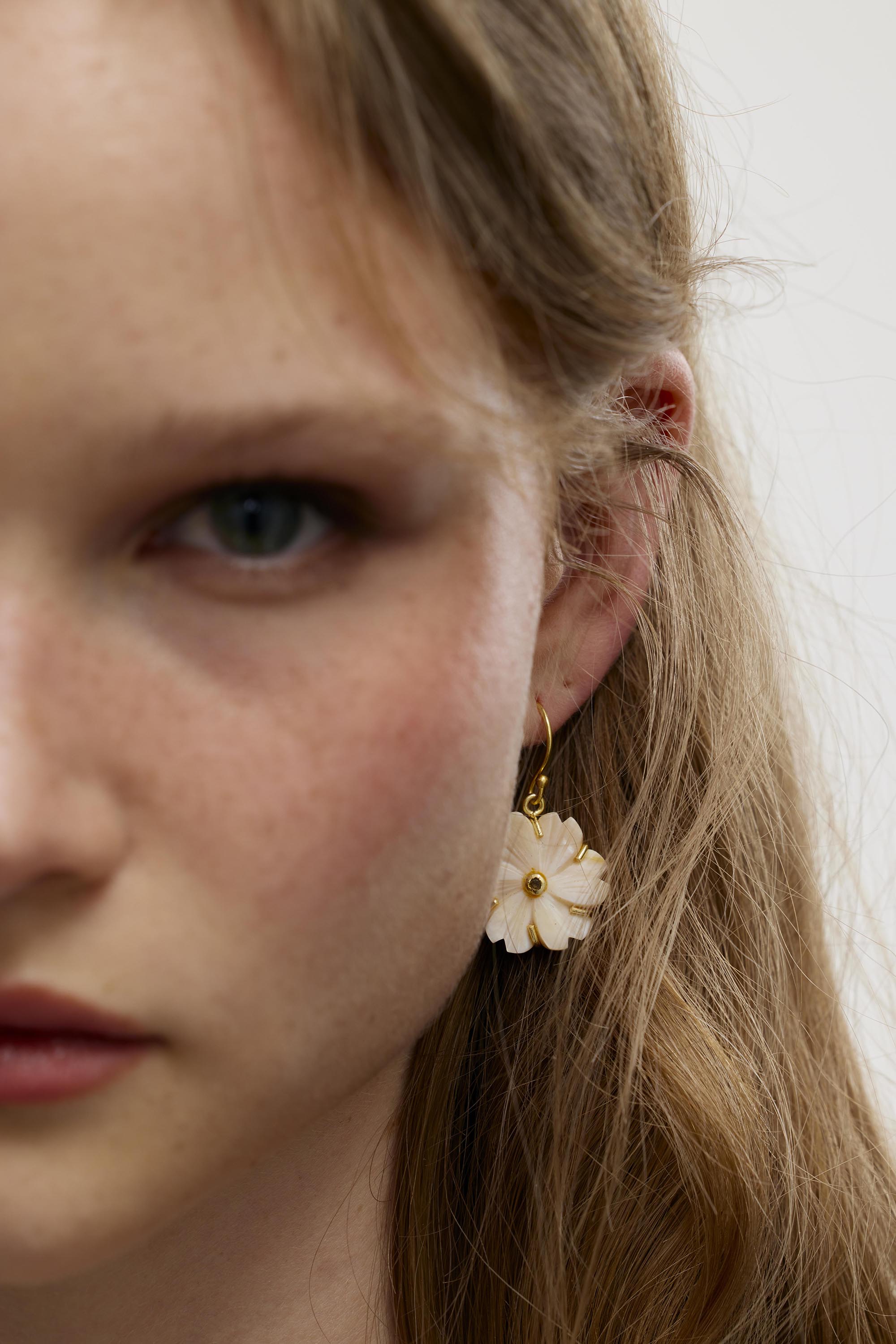 The Mimi Drop Earrings feature intricately hand-carved mother of pearl flowers that drop from fine 18k gold plated brass hooks. A citrine centre adds sparkle and a warm, golden glow.