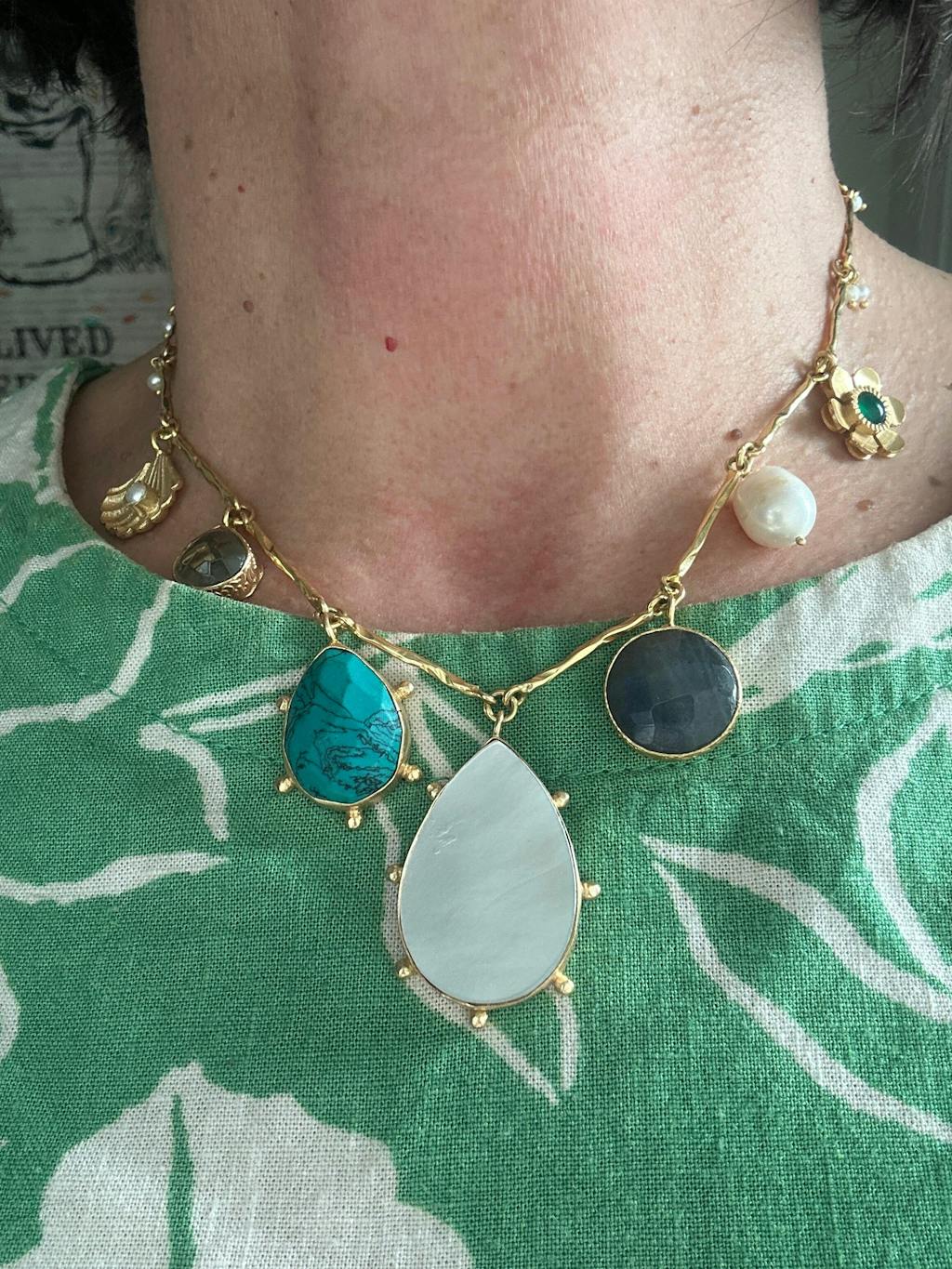 Each link is meticulously hammered by hand and is 18k gold plated brass.  The necklace is adorned with a Mother Of Pearl pear shaped pendant and surrounded by natural gem stone and crystal charms including green onyx, smokey quartz, labradorite, baroque pearl and turquoise.