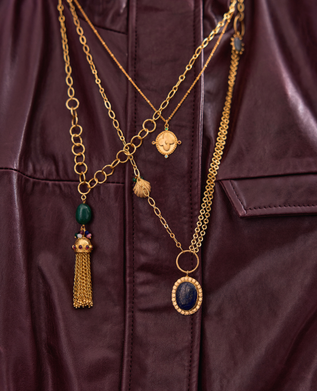 Our collections feature ethical materials, including natural stones and gold-plated brass.