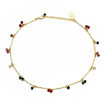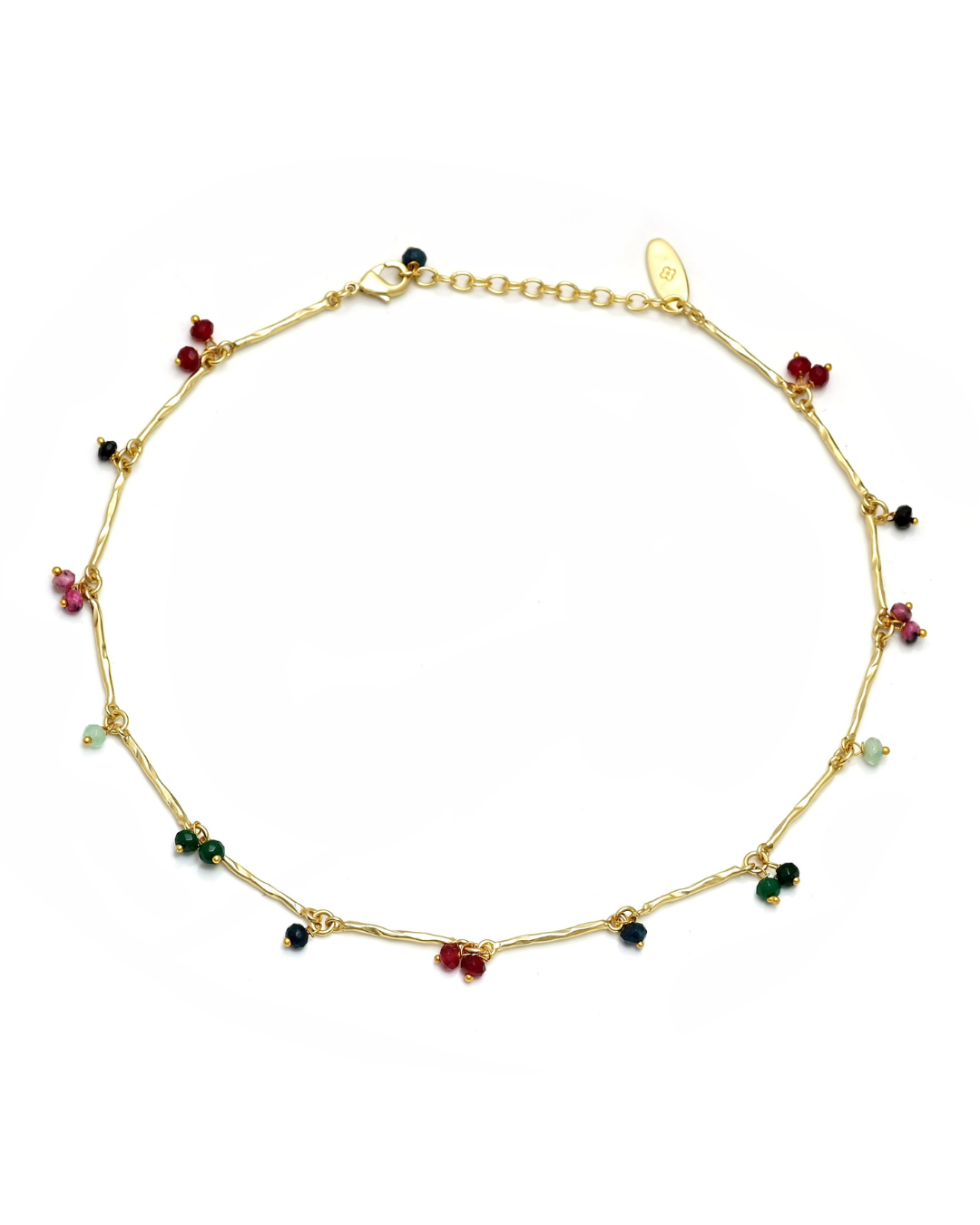 Each link is meticulously hammered by hand with lustrous gold plated brass and adorned with delicate semi precious stones.