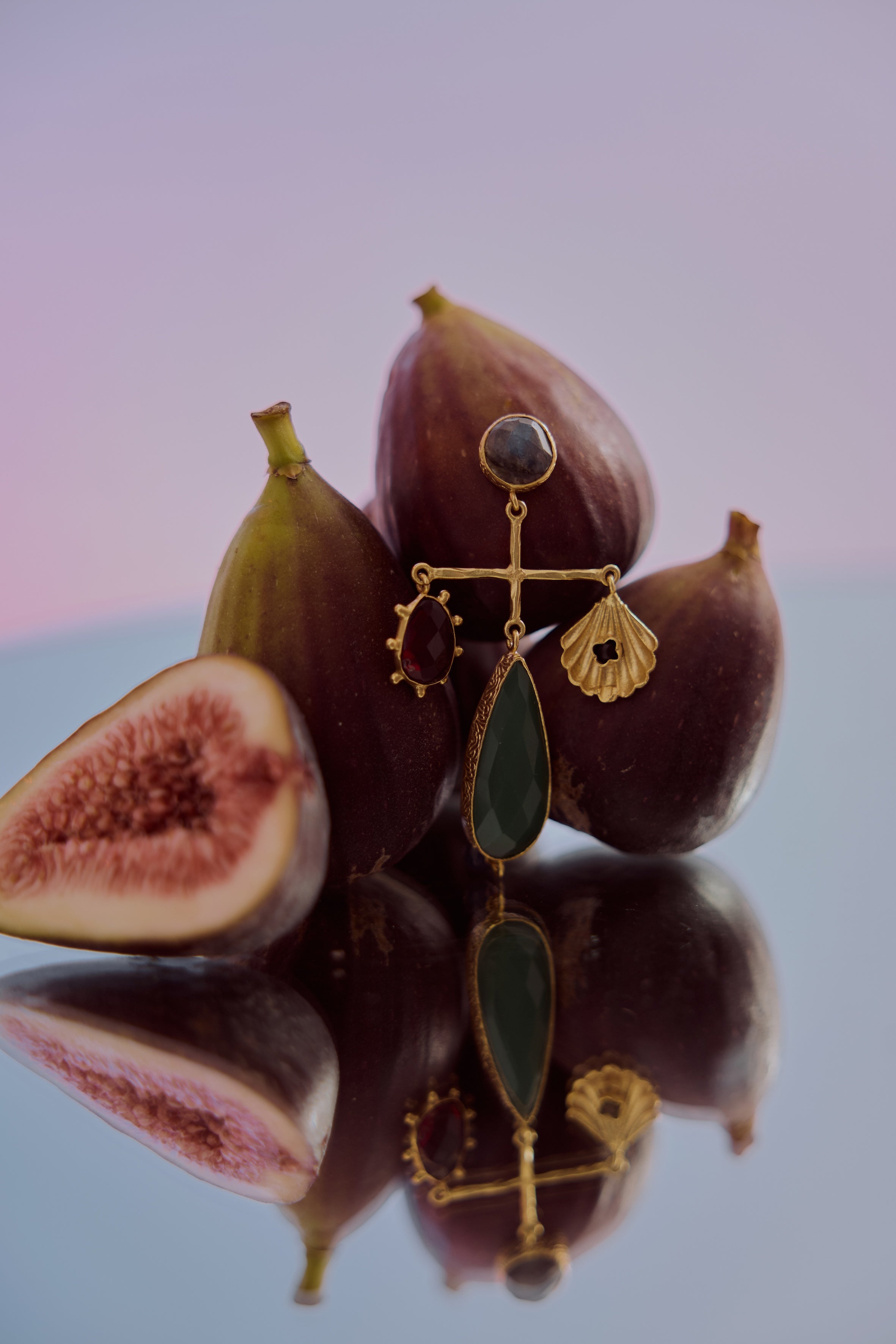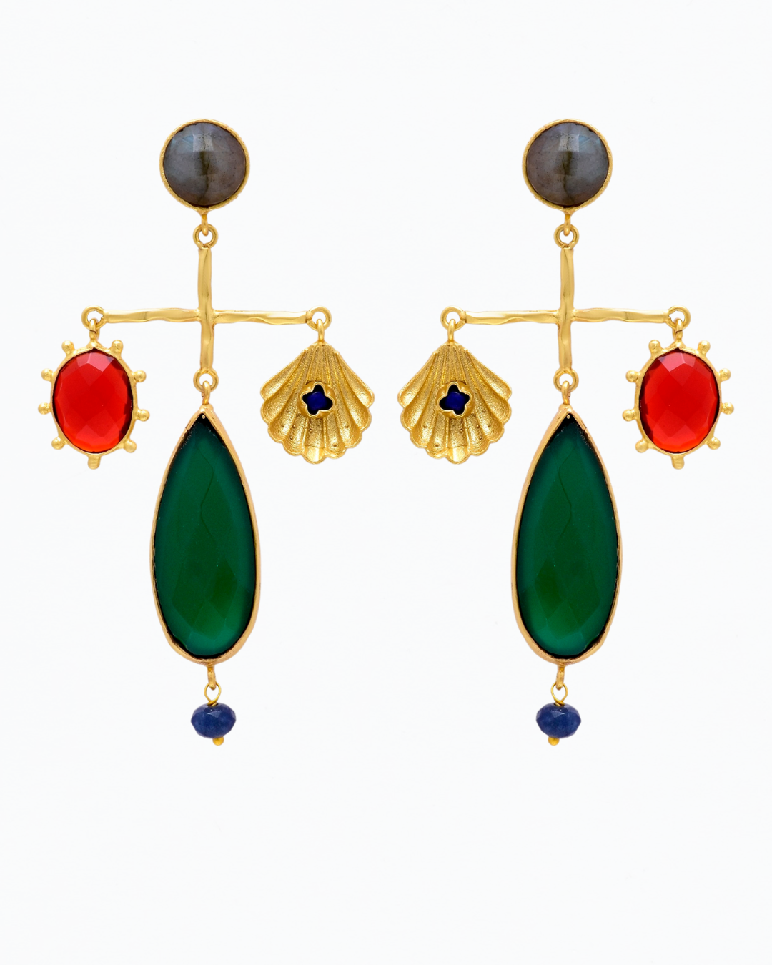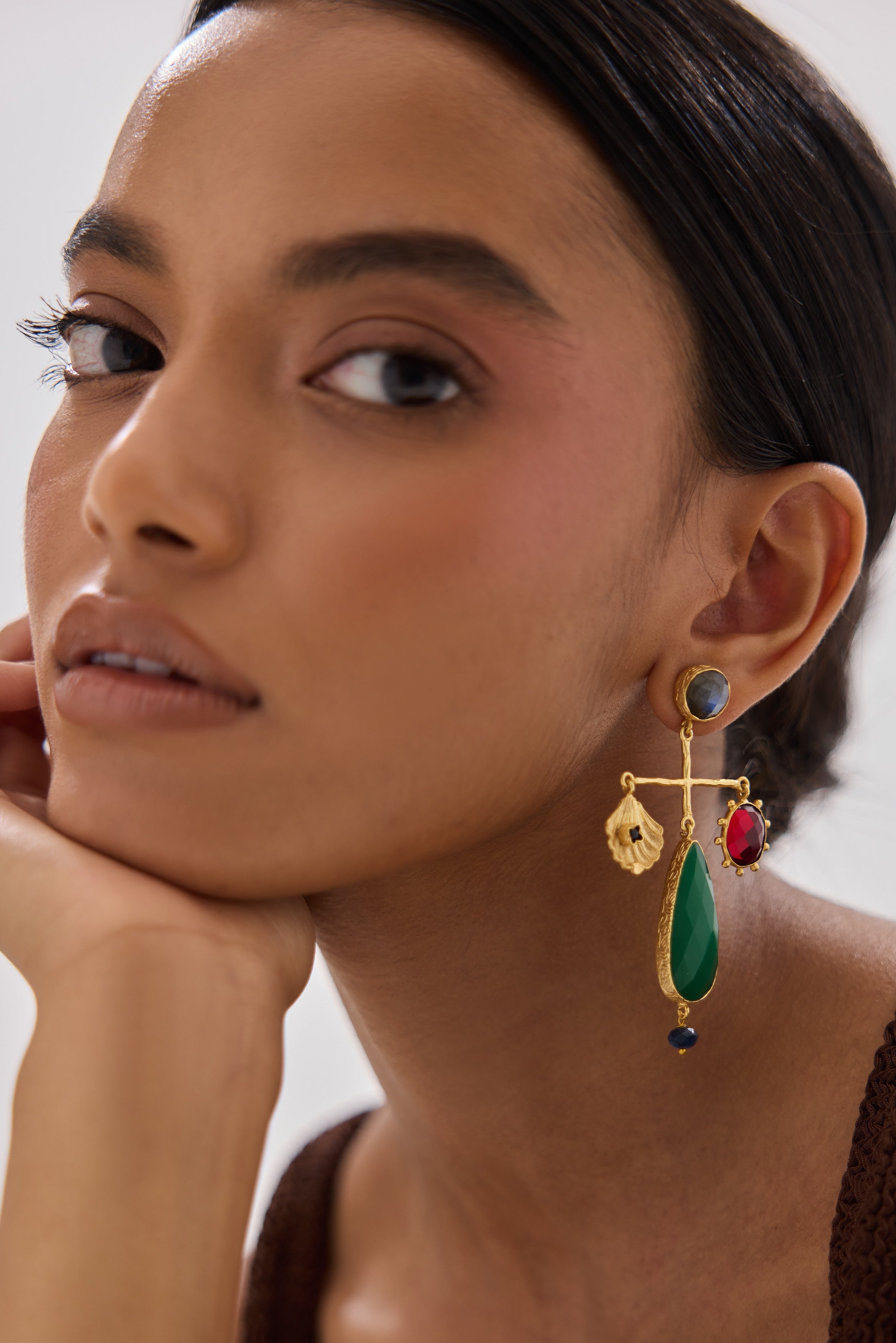 A radiant celebration of colour, craft, and symbolism, our Paisley Charm Earrings are an ode to bold expression and artisan heritage. Handcrafted in 18k gold-plated brass, these sculptural statement earrings bring together stunning natural stones and textures—faceted green onyx teardrops, deep red garnets, labradorite, delicate lapis beads, and golden shell motifs inlaid with black onyx.