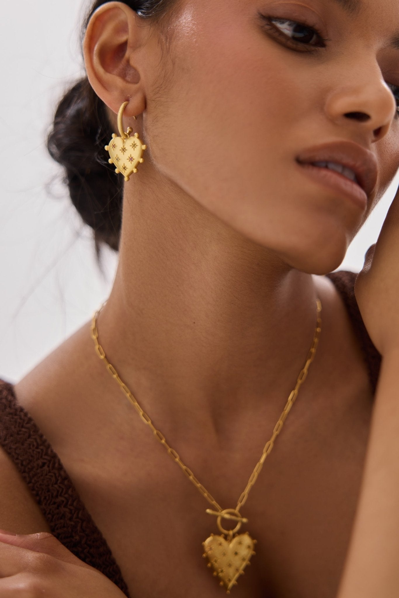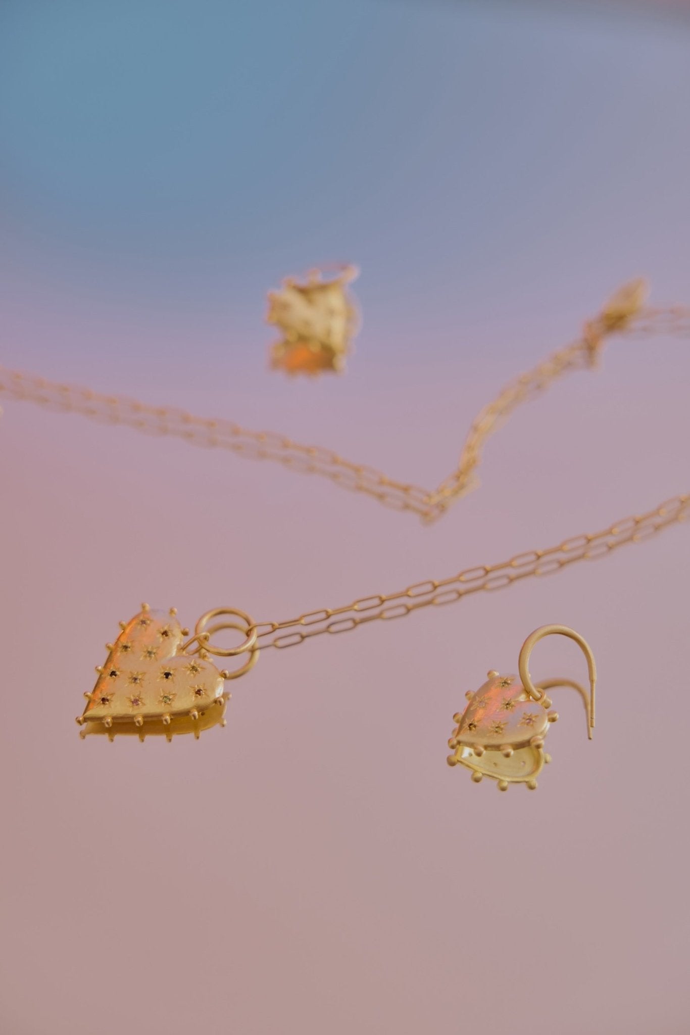 Expertly crafted from 18k gold plated brass in a timeless matte finish, the heart pendant is adorned with hand-etched stars filled with high quality mixed tourmaline stones.