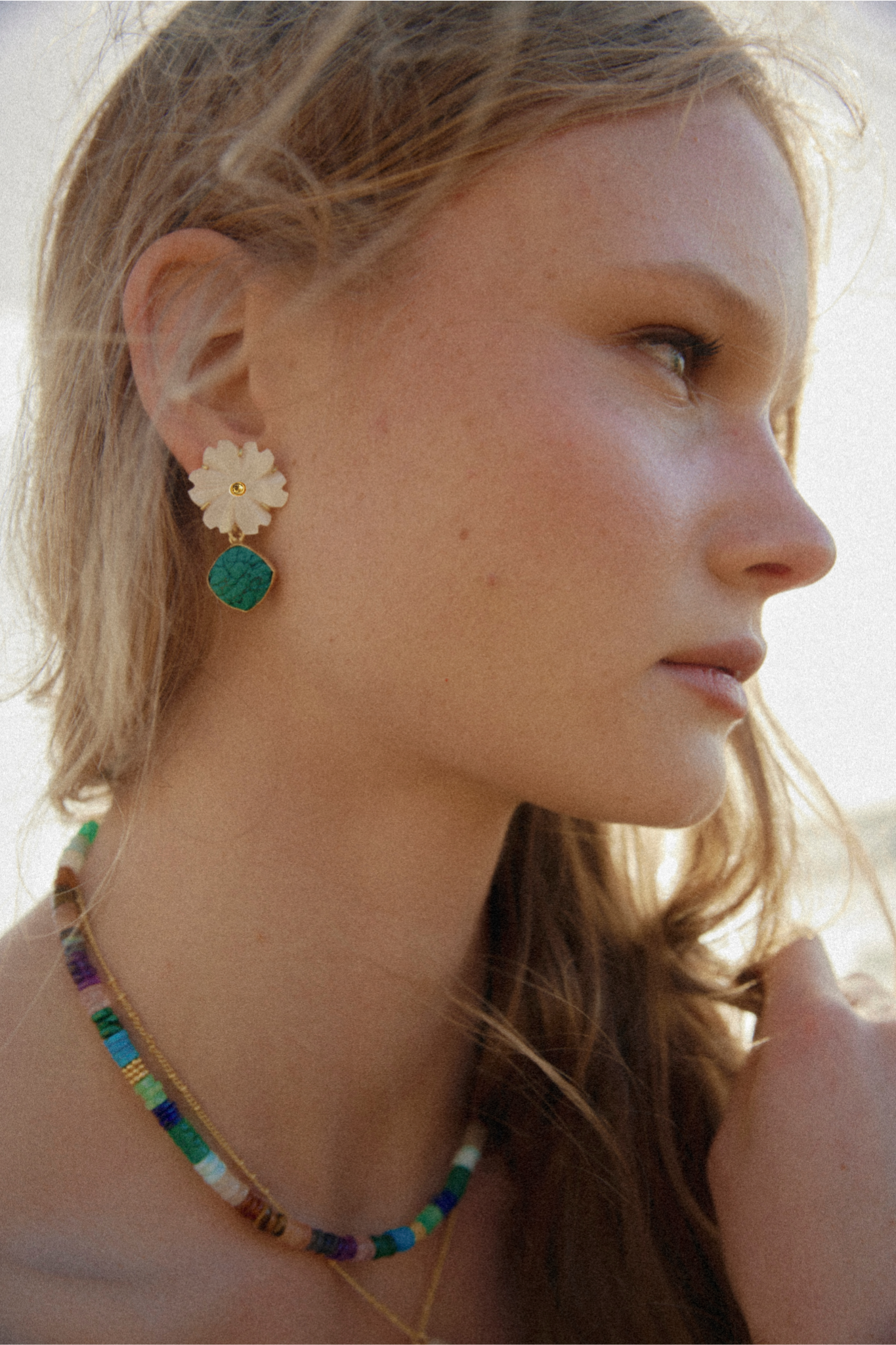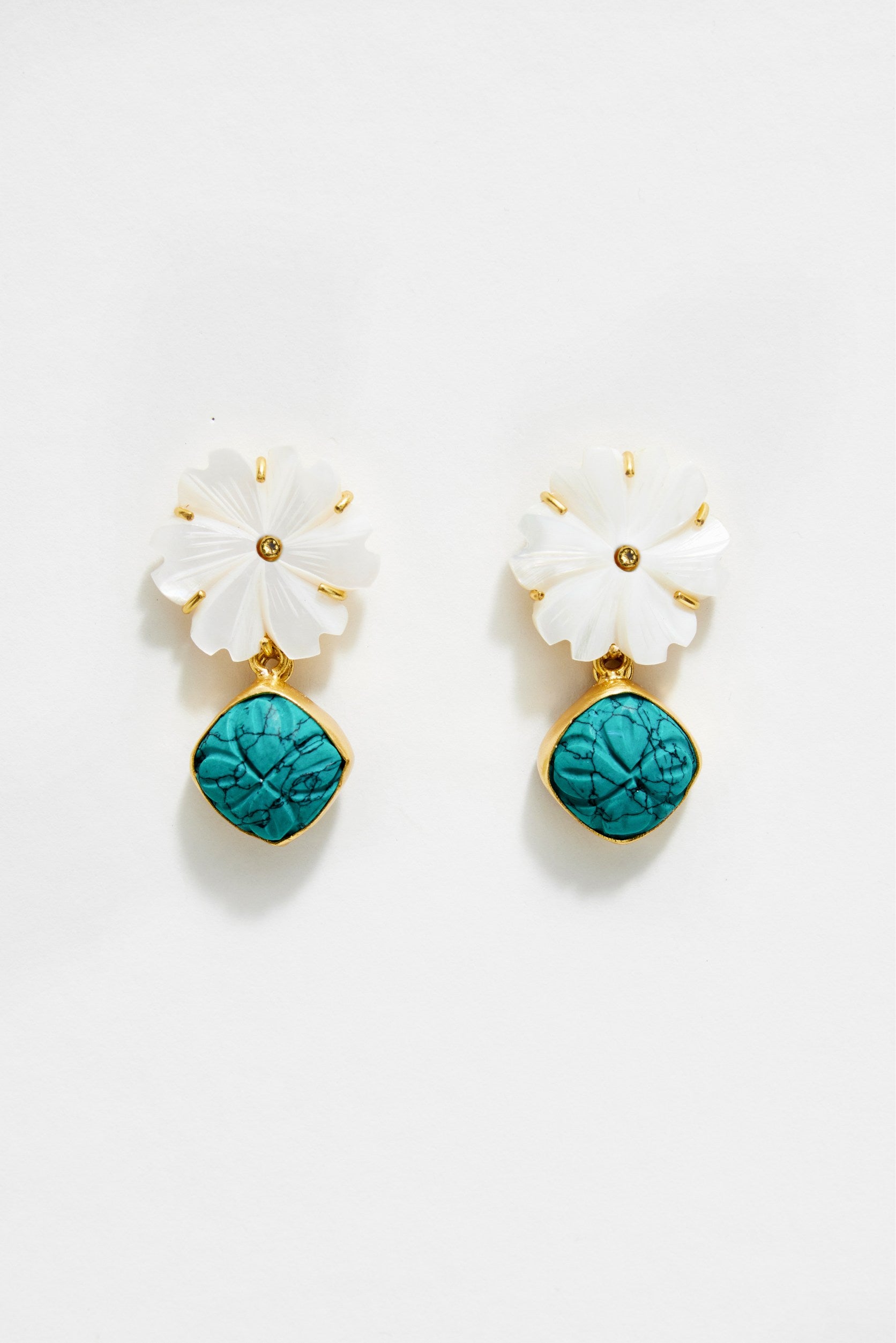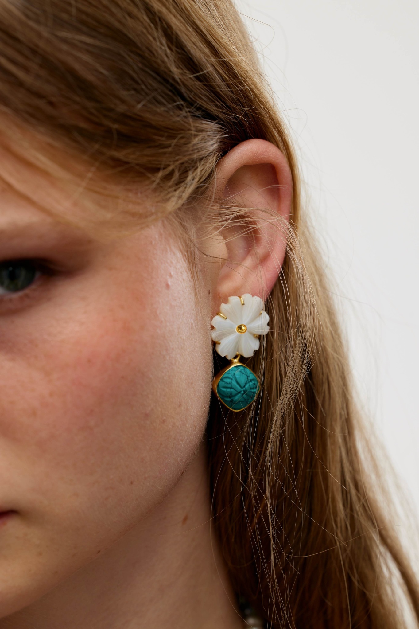 Made for summer with a hand carved mother of pearl flower & citrine collet centre with a turquoise drop carved with an intricate floral pattern.