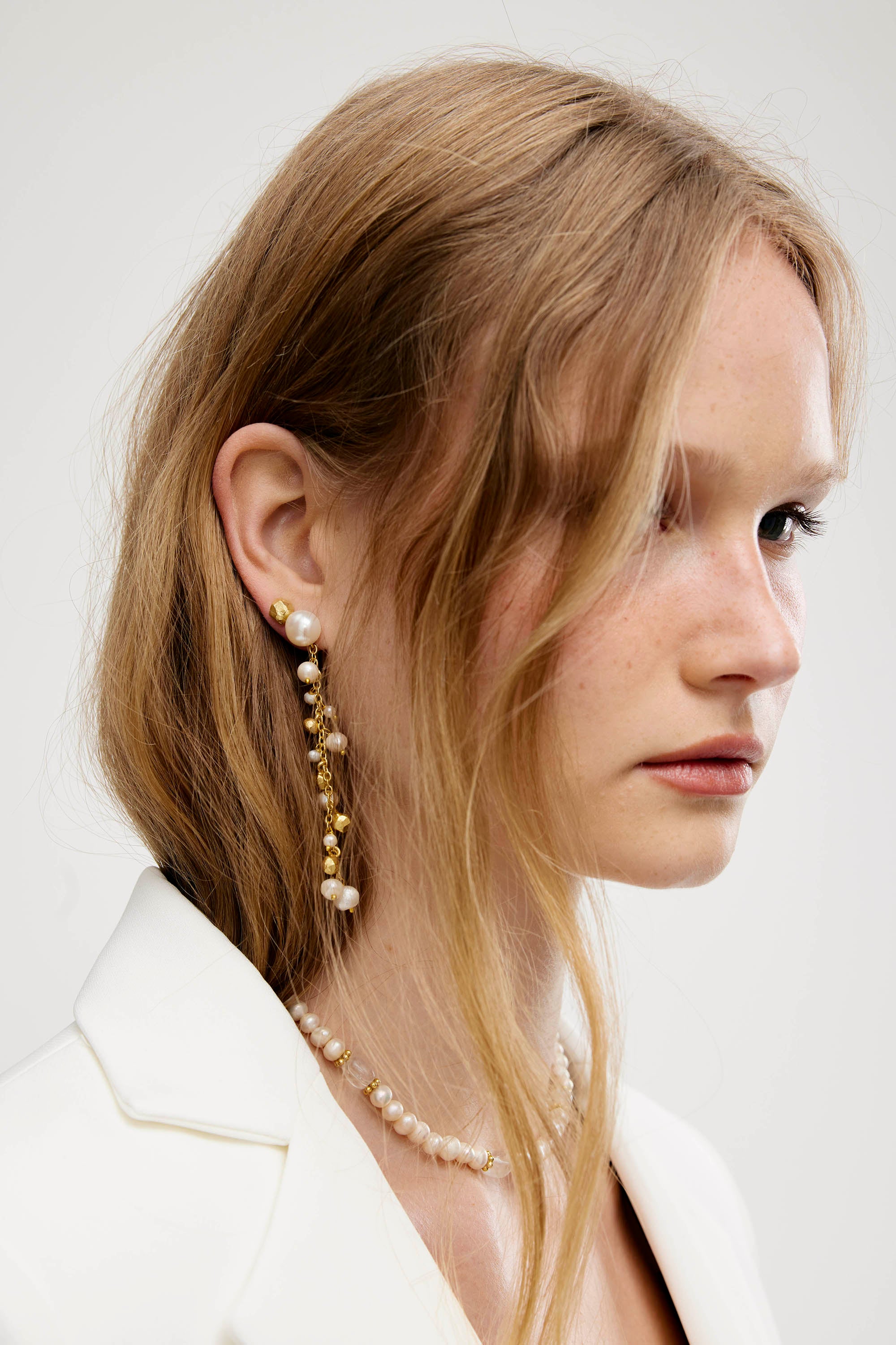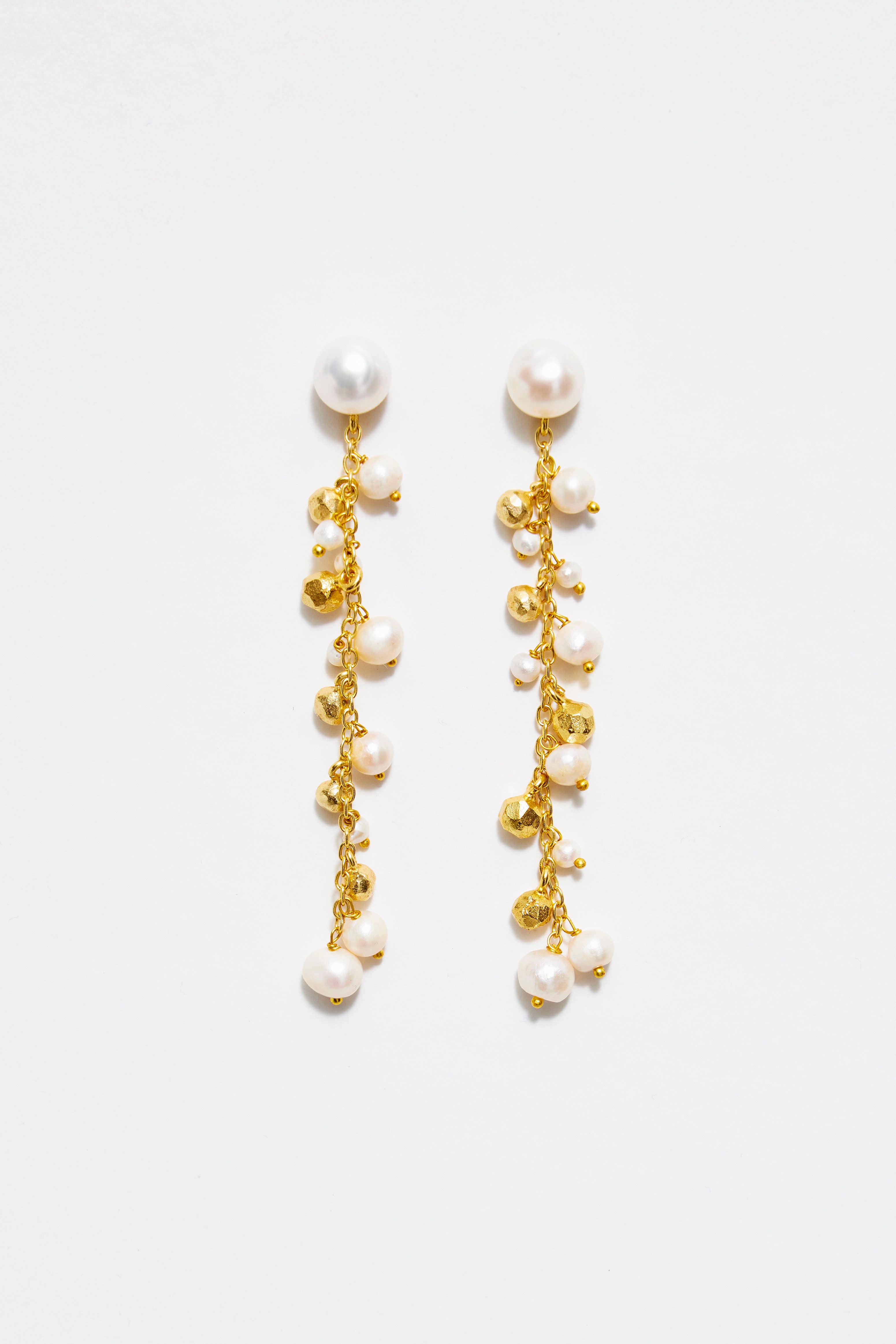 Our Marcella earrings combine a large natural pearl with varying size seed pearls and hammered gold balls to create delicate drop reminiscent of the oceans natural movement and coral formations.