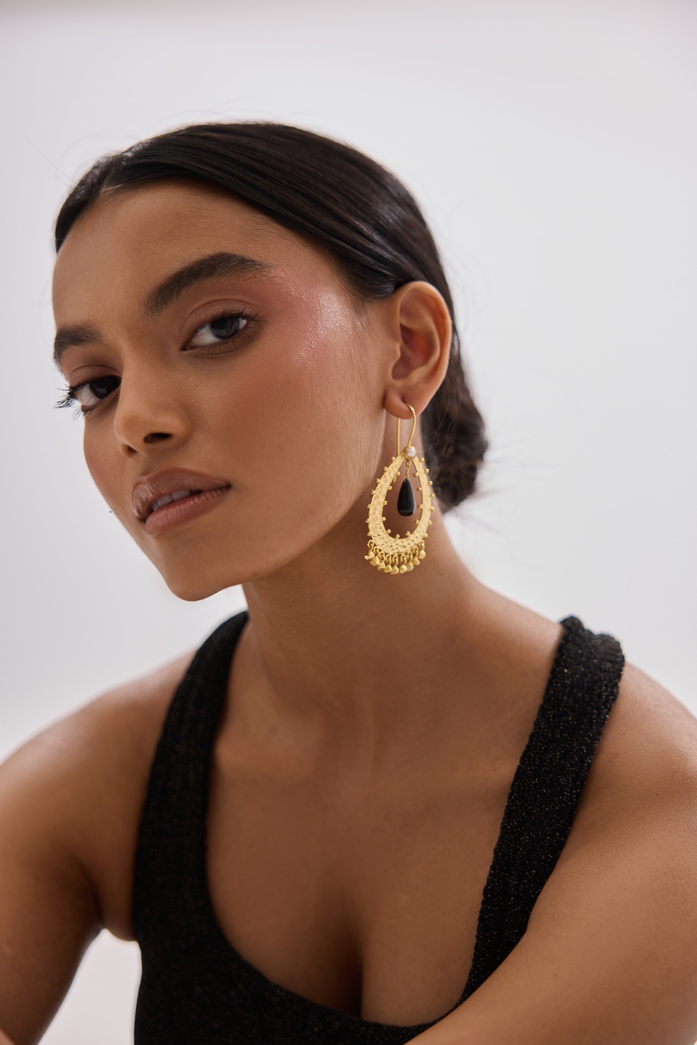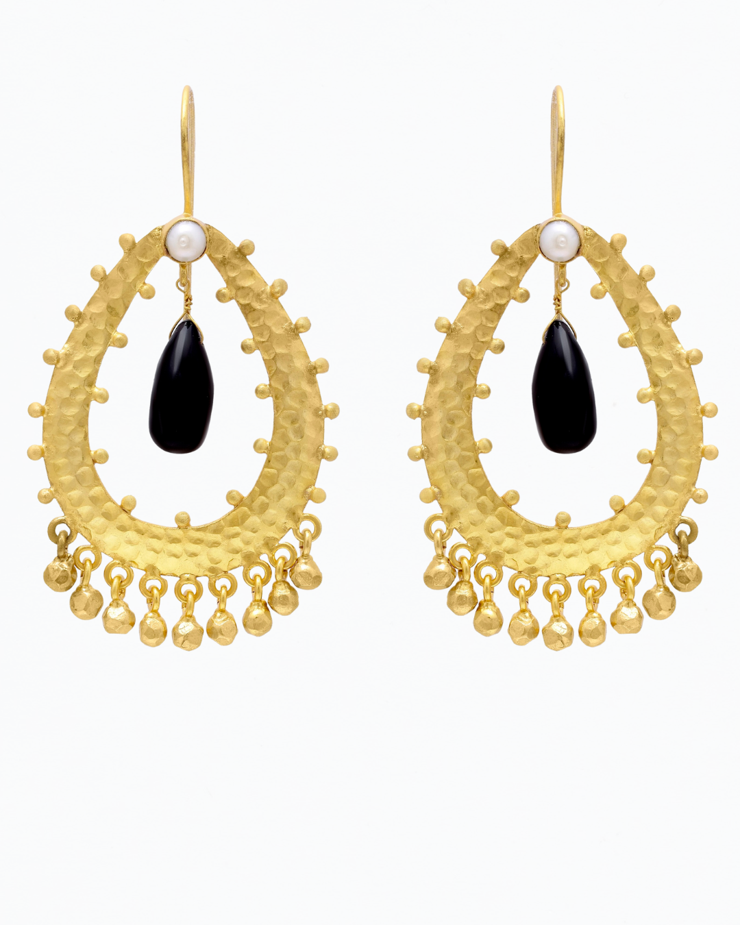 Handcrafted in richly textured 18k gold-plated brass, these teardrop-shaped earrings feature a dramatic black onyx drop, a luminous freshwater pearl stud, and a fringe of delicate gold beads that sway with movement.